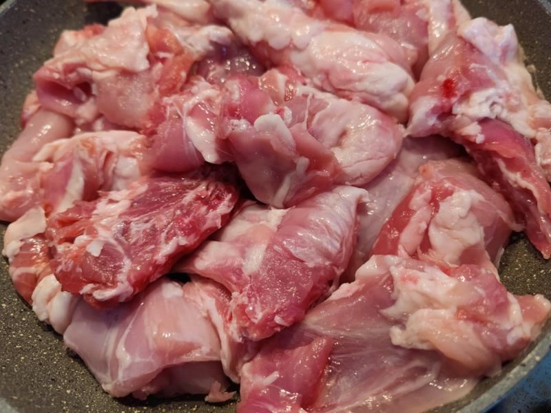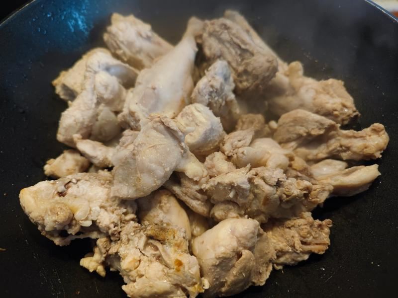 兔肉炒至水份沥干后,肉都变白色了。