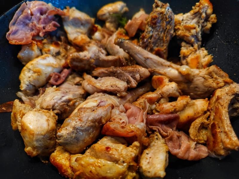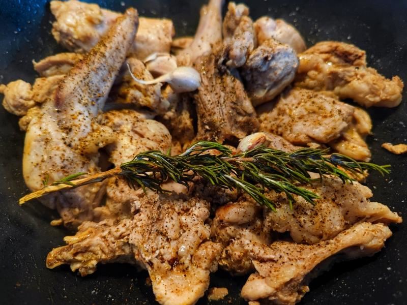 然后继续煎香兔肉,加三勺橄榄油,黑胡椒,蒜瓣,迷迭香,煎至兔肉金黄