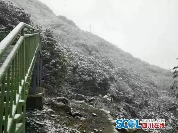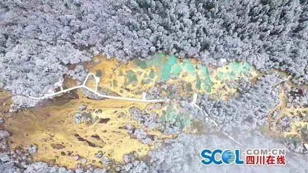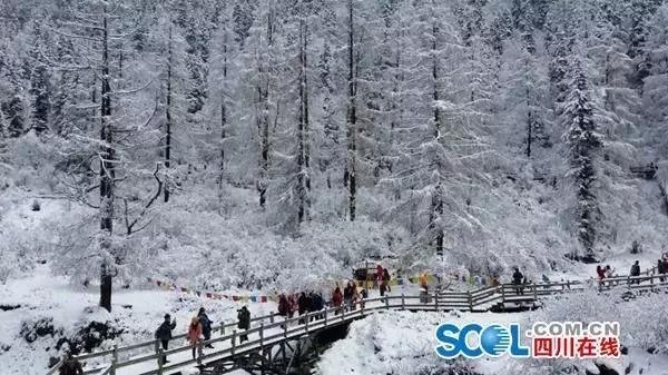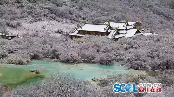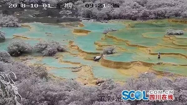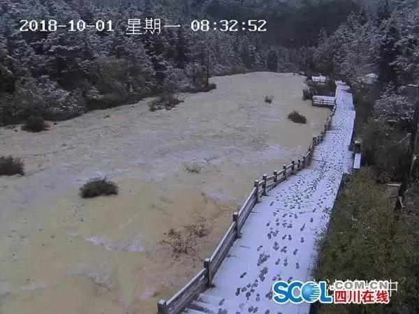 黄龙景区的入秋初雪从9月30晚开始降临,一夜之后,在国庆节当天“变身”雪色童话世界。10月1日,黄龙景区管理局的现场直播画面显示,这场降临的入秋初雪,洋洋洒洒,让整个黄龙都沐浴上了纯白的“泡沫”,积雪虽薄,但景区木栈道上的一串串游客脚印清晰可见。