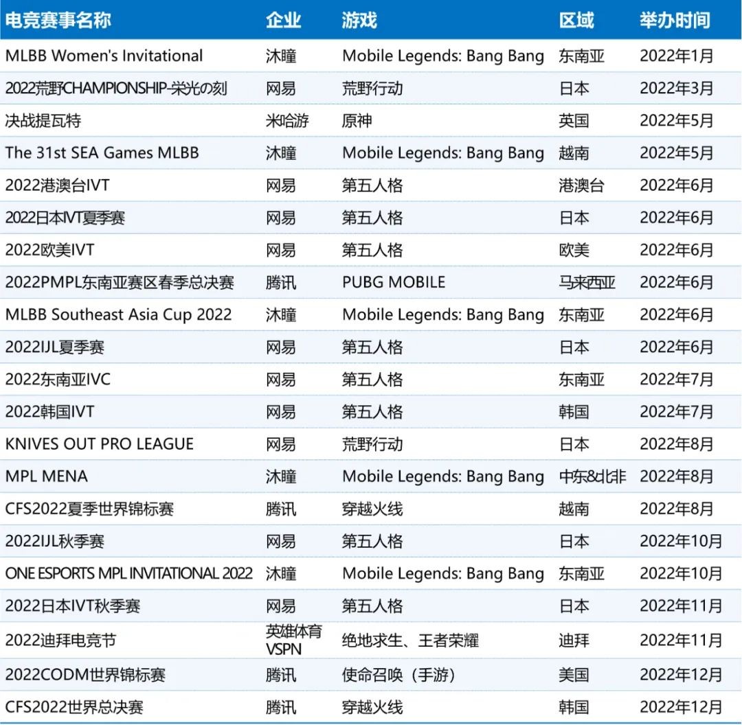 以沐瞳电竞为例,自2017年起,基于《Mobile Legends: Bang Bang》,我们率先践行“电竞出海”,面向全球用户打造了专业化、国际化、多元化的移动电竞赛事体系,沐瞳也是最早一批建立海外职业移动电竞体系的中国公司。2019年、2021年和2022年,《Mobile Legends: Bang Bang》连续三届入选了东南亚运动会正式电竞比赛项目。